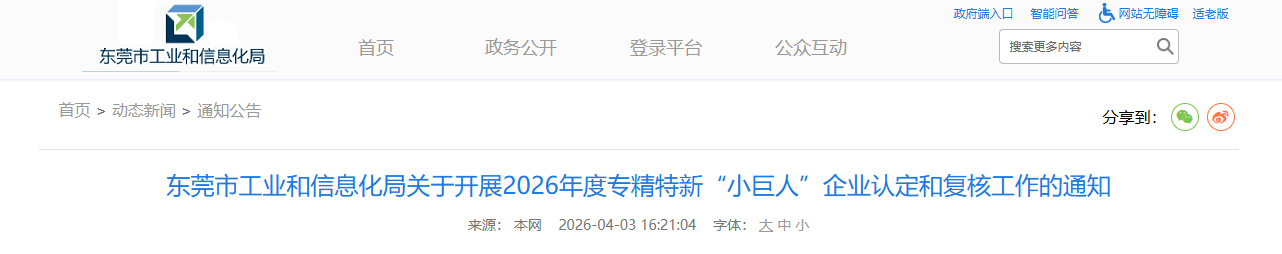 根据《广东省工业和信息化厅关于开展2026年度专精特新“小巨人”企业认定和复核工作的通知》(粤工信融资函〔2026〕9号)要求,现组织开展2026年度专精特新“小巨人”企业认定和复核工作。有关事项通知如下: