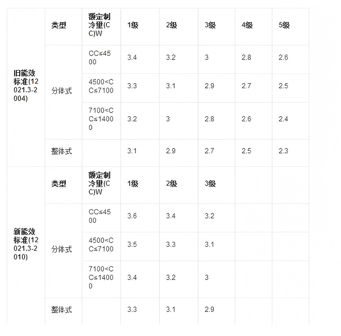 那么有同学要问了,为什么我家的空调上只有3级呢?因为2010年后推出的空调,大部分采用的都是2010版的3级能效比分类。