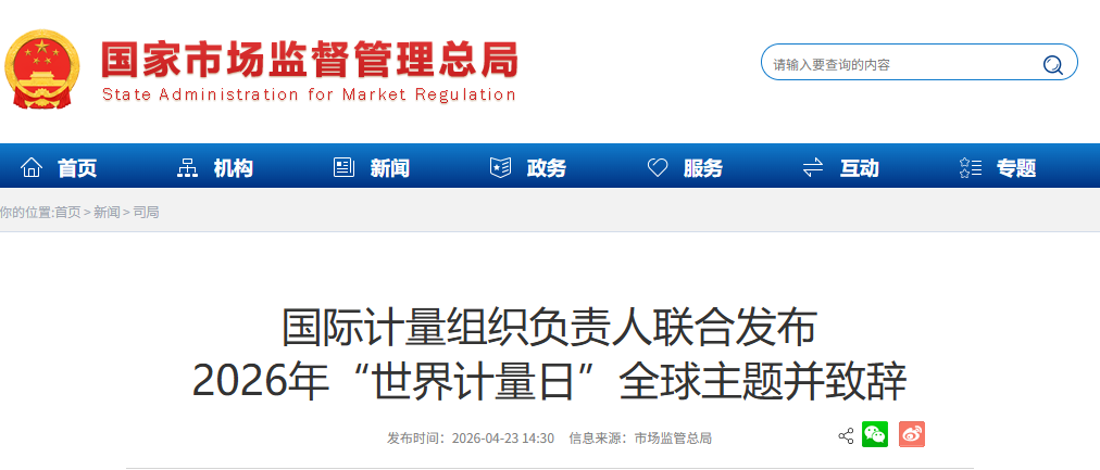 市场监管总局将于5月20日在河南省郑州市举办2026年“世界计量日”主题活动。