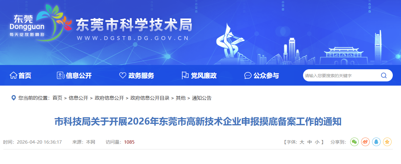 为做好我市2026年高新技术企业(下称“高企”)组织申报工作,进一步精准服务企业,现启动2026年东莞市高新技术企业申报摸底备案工作。具体通知如下: