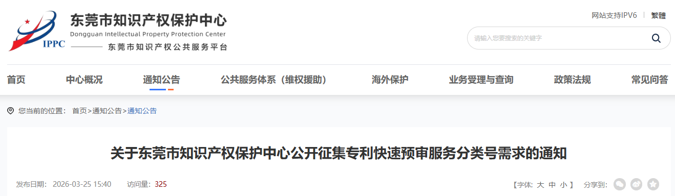 各有关单位: 经国家知识产权局批复,东莞市知识产权保护中心将面向智能终端和新材料产业领域开展专利快速预审工作。为科学合理确定本中心专利快速预审服务分类号范围,精准匹配我市支柱、战略性新兴产业及创新主体实际需求,我中心现面向各创新主体公开征集专利快速预审服务分类号需求。具体事项通知如下: 征集主体范围 登记注册地在东莞市行政区域,且具有独立法人资格的企事业单位(包括高校、科研院所等创新主体)。 征集内容及要求 纳入征集范围的专利分类号应当满足: (一)所属领域属于智能终端或新材料产业相关领域(参考附件1),且相关专利申请需求量大; (二)发明与实用新型专利的IPC分类号应在《2026.01版IPC分类表》(附件2)中选择,不超过5个; (三)外观设计专利的洛迦诺分类号应在《国际外观设计分类表(第15版)》(附件3)中选择,不超过10个; (四)IPC和洛迦诺分类号均须细分到小类,如“H04M”和“14-01”(分类号查找指引见附件4)。 征集时间 2026年3月25日至4月8日。 反馈方式 填写《东莞市知识产权保护中心预审分类号征集表》(附件5),并将可编辑电子版及盖章PDF扫描件发送至电子邮箱dgbhzx773@dg.gov.cn。联系人:江启来,联系电话:0769-26986566。