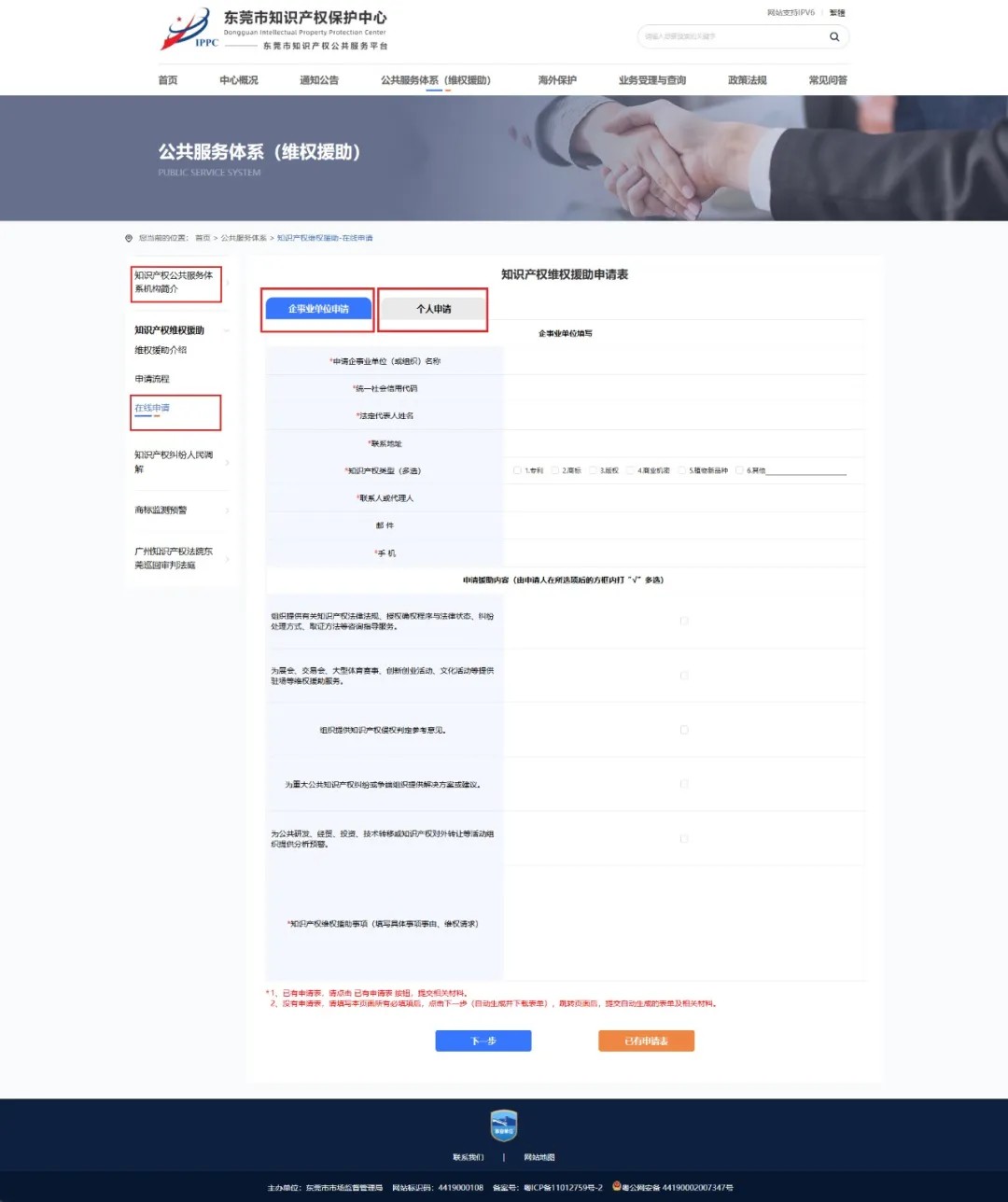 为进一步完善涉企服务,优化营商环境,健全知识产权诉求快速响应机制,东莞市知识产权保护中心面向市内创新主体开展知识产权快速协同保护工作,在全市范围内提供知识产权纠纷调解、维权援助的在线申请、在线办理等服务,进一步强化知识产权保护,助力我市创新主体维权援助诉求实现快速办、指尖办、一次办。 服务内容 1 公益援助 为自然人、法人或其他组织的专利、商标、地理标志、集成电路布图设计等知识产权维权援助申请提供公益援助。 2 咨询指导 组织提供有关知识产权法律法规、授权确权程序与法律状态、纠纷处理方式、取证方法等咨询指导服务。 3 侵权判定 组织提供知识产权侵权判定参考意见。 4 纠纷解决 为重大公共知识产权纠纷或争端组织提供解决方案或建议。 5 分析预警 为公共研发、经贸、投资、技术转移或知识产权对外转让等活动组织提供分析预警。 6 驻场维权 为展会、交易会、大型体育赛事、创新创业活动、文化活动等提供驻场等维权援助服务。 申请条件 满足上述知识产权维权援助服务内容,且符合下列条件的,即可在线上提交申请: 1.有明确的侵权对象,有具体的维权诉求、事实和理由; 2.知识产权维权援助申请人的户籍所在地、经常居住地或营业地在东莞市辖区内; 3.知识产权侵权行为发生地在东莞辖区内。 提交材料 1.《知识产权维权援助申请表》; 2.申请人的有效身份证明、法人和其他组织统一社会信用代码证书或其他证明文件; 3.申请知识产权维权援助事项、事由以及相关证明材料。 申请指引 1 线上提交 登录“东莞市知识产权公共服务平台”(网址:http://dippc.dg.cn/),路径:公共服务体系(维权援助)-知识产权维权援助-在线申请,即可进行申请书提交。 第一步:电脑端输入网址“http://dippc.dg.cn/”,进入“东莞市知识产权公共服务平台”,在首页点击“公共服务体系(维权援助)”。 第二步:点击展开“知识产权维权援助”栏目,出现“在线申请”并点击,根据主体性质选择“企事业单位申请”或“个人申请”进行在线填报并提交。 第三步:上传已盖章的维权申请表以及其他相关佐证材料。 完成提交后,东莞市知识产权保护中心或知识产权维权援助机构将在5个工作日内审查材料是否符合受理条件,15个工作日内自行处理或组织、协调专家库专家处理知识产权维权援助事项,并将意见反馈至申请人。 2 电子邮件方式提交 提交相关材料至市知识产权保护中心邮箱 : dgamrbhzx505@dg.gov.cn,备注:申请人名称+知识产权维权援助申请。 咨询电话:0769-26986773; 地址:市知识产权保护中心,东莞市南城街道东莞大道南城段112号501室